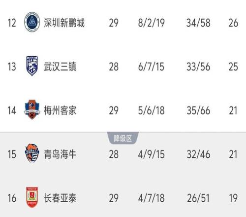 最新积分榜方面,亚泰7轮不胜仍积19分,是唯一积分没有突破20分的球队,继续排在积分榜垫底。梅州客家拿到宝贵的1分之后,与青岛海牛同积21分,在现在一场的情况下凭借相互战绩的优势再次逃离降级区,海牛未战跌入降级区。